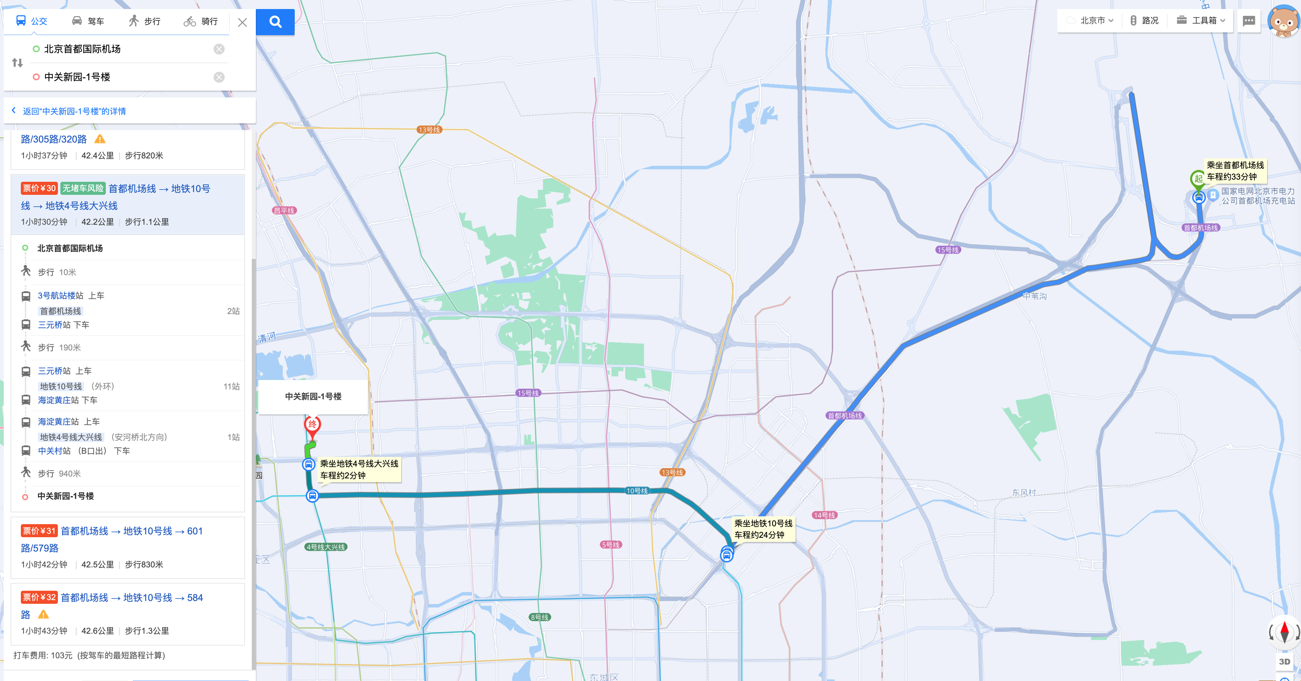 From Capital International Airport T2/T3 terminal station (CIA subway line) -> Sanyuanqiao station -> Subway line 10, Haidianhuangzhuang Station -> Subway line 4 -> Zhongguancun Station (Exit B)